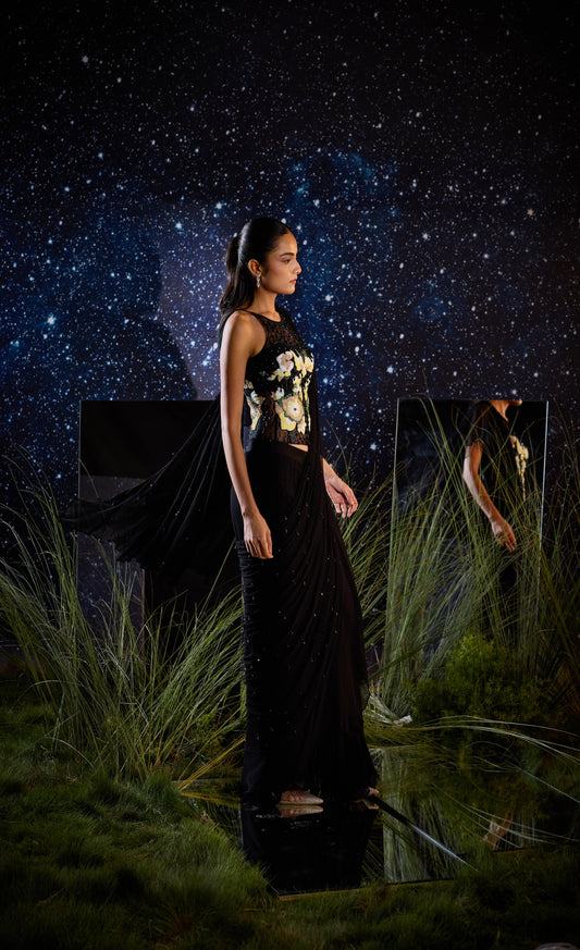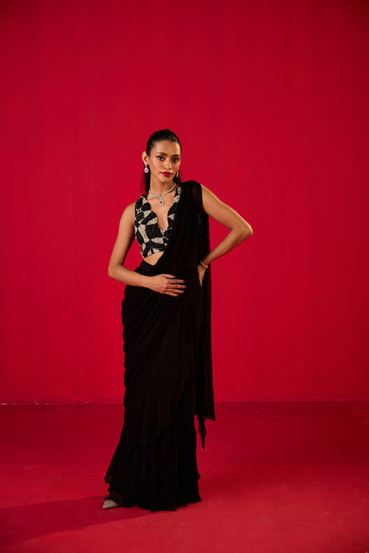 BLACK PLAIN RUFFLED STITCHED SAREE WITH EMBROIDERED BLOUSE